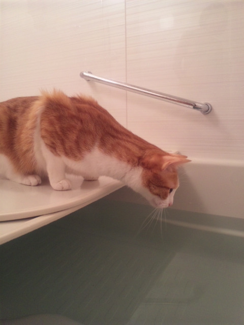 こちらが湯舟に浸かってる間も浴槽の端に陣取り、時折片手でお湯をちゃぷちゃぷ。たまにぴちゃぴちゃとお湯を飲んでみたり。