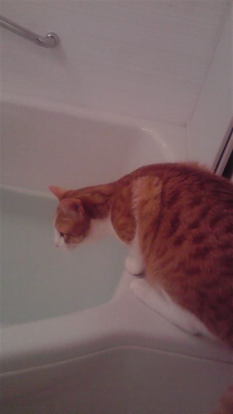 風呂場の床で足裏(肉球裏?)が濡れるのもなんのその、浴槽の縁まで登ってきて恐る恐る前足をお湯に伸ばしてきて…触れた瞬間引っ込める!を繰り返す。
