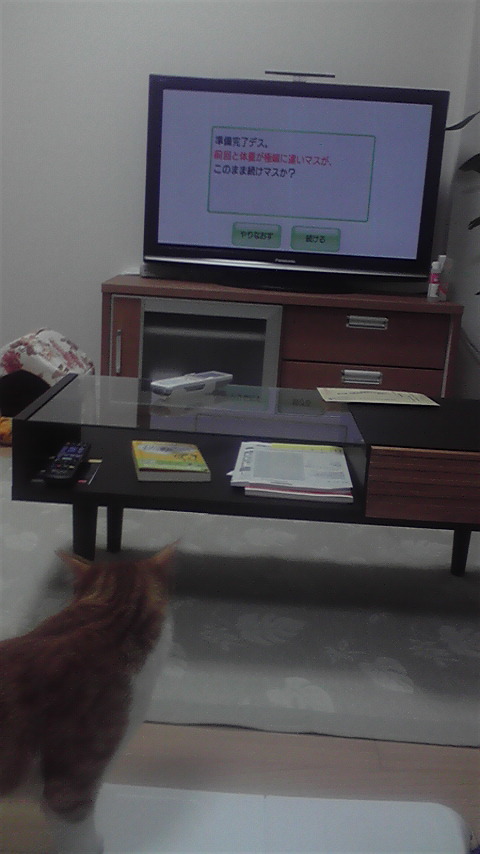 ちなみにWii Fitには「ペット測定」という機能も備わっていまして、玉三郎の体重の推移も記録できるのですが、「ペットの方はトレーニングはご遠慮下さい」と画面に注意が出ます。
