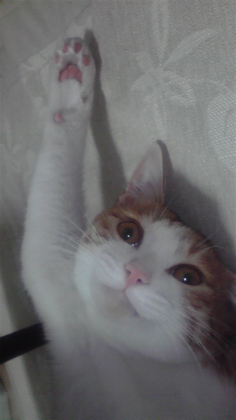 彼は書斎で遊ぶのはあまり好きではないらしく、リビングに僕を誘い出すことに懸命です。書斎の入り口に来ては何度もにゃあ~(おそらく意味は『遊ぼうよぉ』)」と呼び掛け、「先に行って待ってるからね」という感じでトットットッとリビングへ小走りで戻ります。僕がそのまま仕事を続けていると、さっきよりいくらか強めの口調で再び呼びに来ます。これを繰り返すこと4~5回。たまにVチェックしている画面の前に立ち塞がったり、台本の上に座り込んだりという強硬手段にでることもあります。